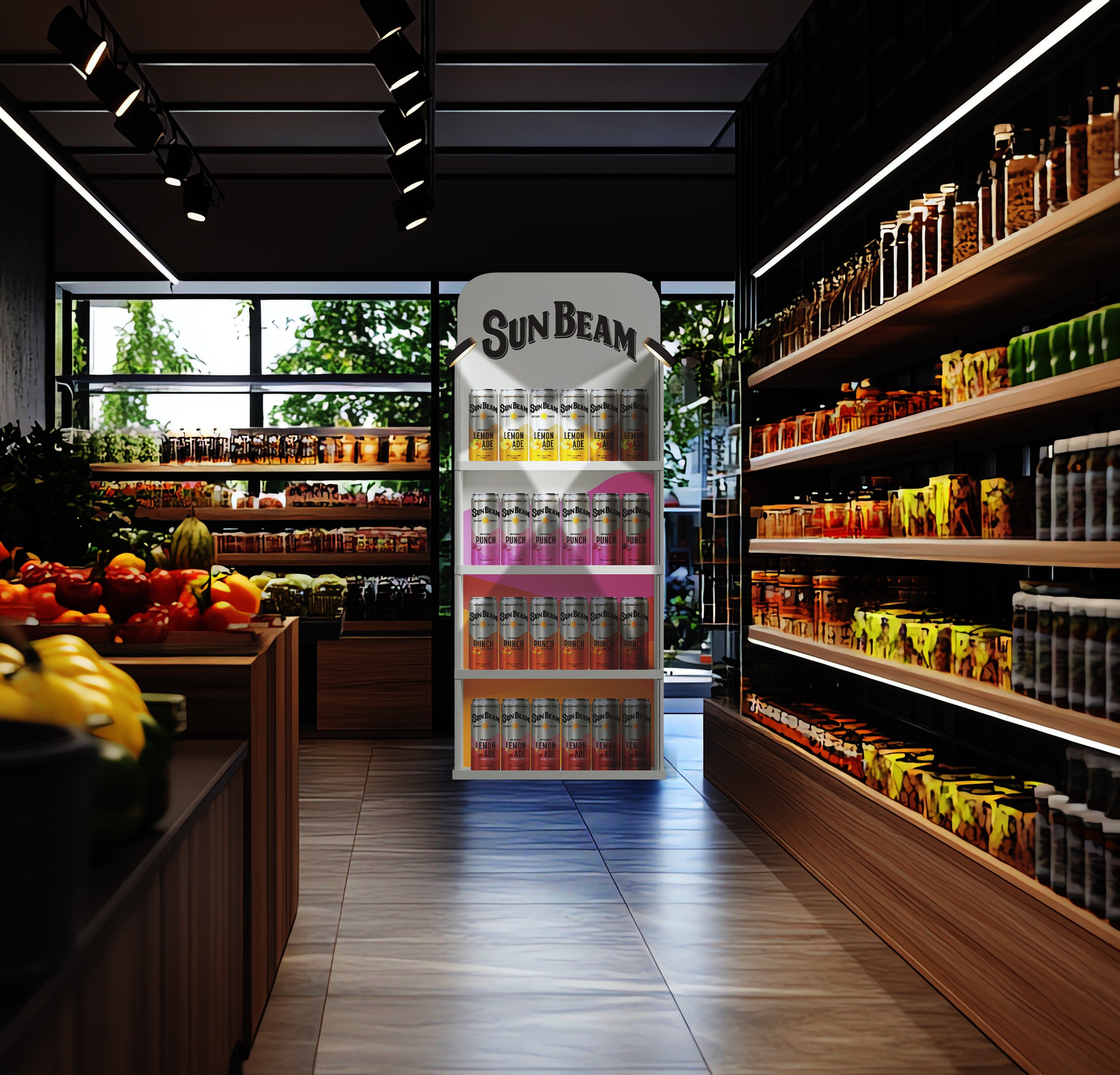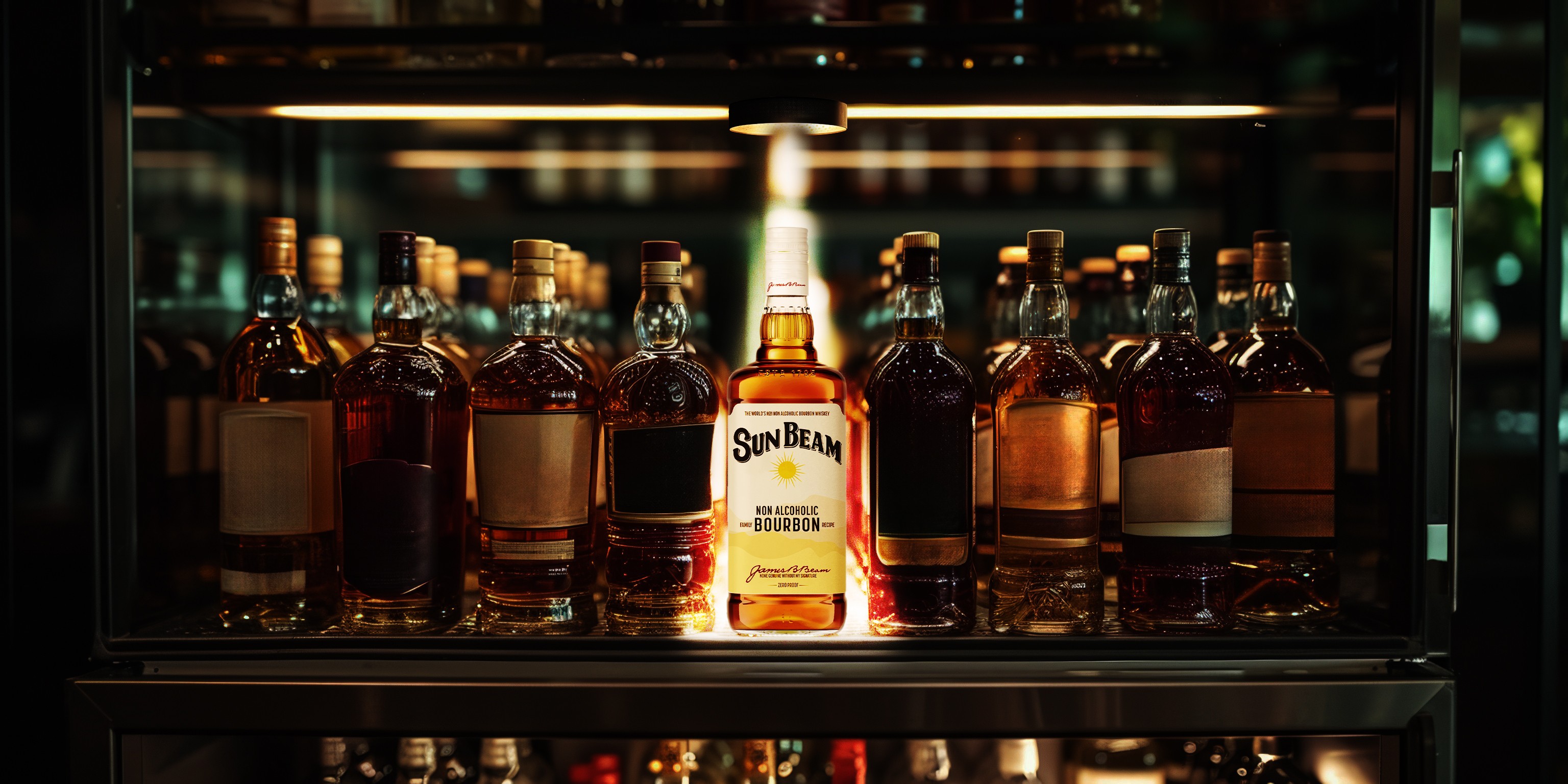 Light installations above Sun Beam bottles in bar shelves.