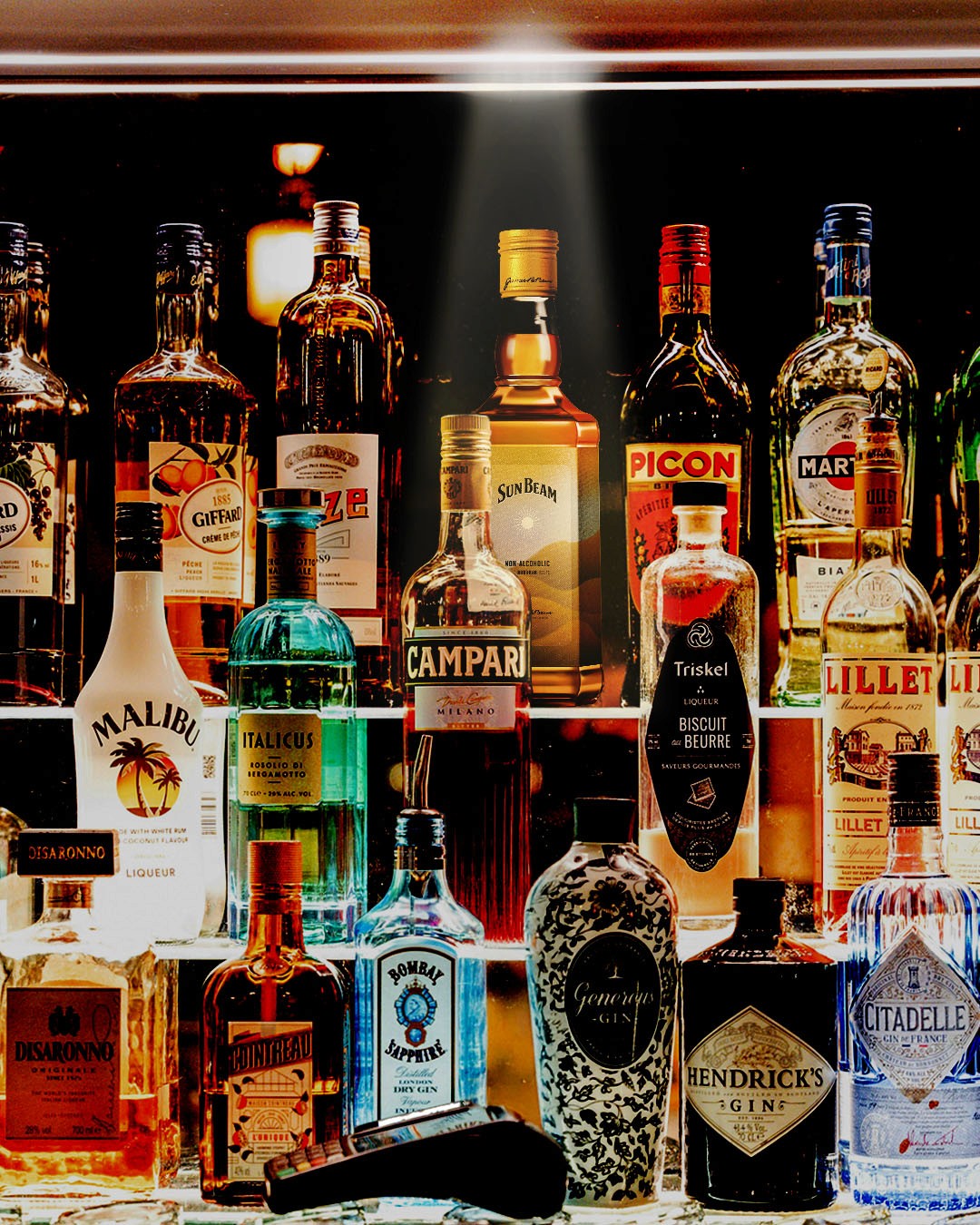 We placed light installations above Sun Beam bottles in bar shelves.